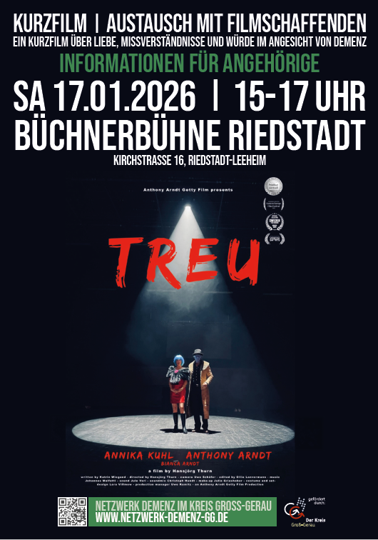 Der preisgekrönte Kurzfilm „TREU“ startet eine besondere Charity-Kino-Tournee des Schauspielers Anthony Arndt und des Regisseurs Hansjörg Thurn, die in Kooperation mit der Deutschen Alzheimer Gesellschaft durch deutsche Städte und Kinos zieht. Ziel dieser Tournee ist es, auf die oftmals unsichtbare Belastung der Angehörigen von Menschen mit Demenz aufmerksam zu machen. Am 17.01.2026 von 15:00-17:00 Uhr gastiert die Tournee auf der BüchnerBühne in Riedstadt.