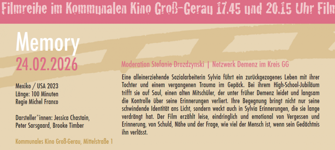 Begleitet von Moderatorin Stefanie Drozdzynski wird am 24.02.2026 der Film "Memory" gezeigt. Das komplette Programm finden Sie hier.