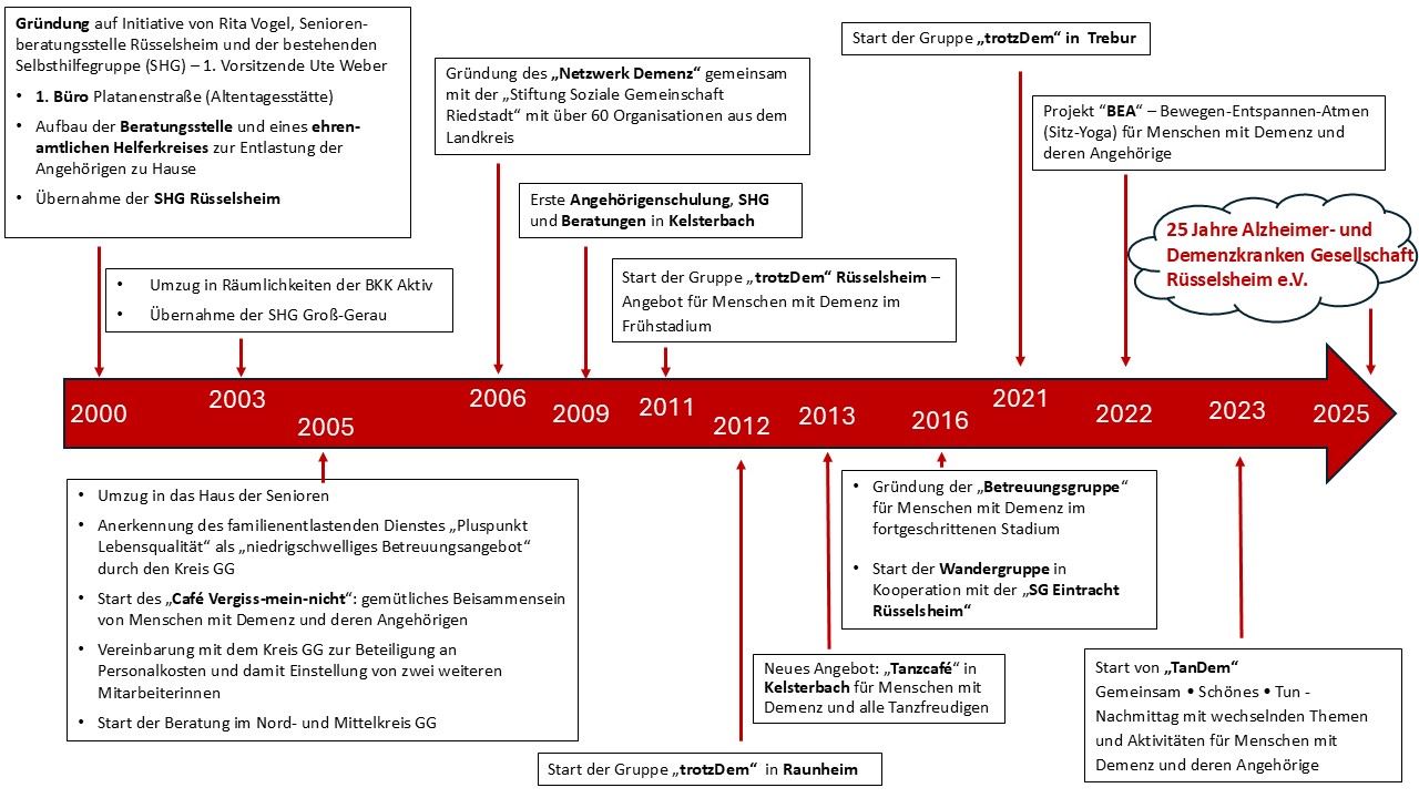 Die Alzheimer- und Demenzkranken Gesellschaft Rüsselsheim blickt 2025 bereits auf 25 Jahre erfolgreiche Tätigkeit zum Thema "Selbsthilfe Demenz" zurück. Einen kurzen Überblick über unsere Entwicklung finden Sie hier.