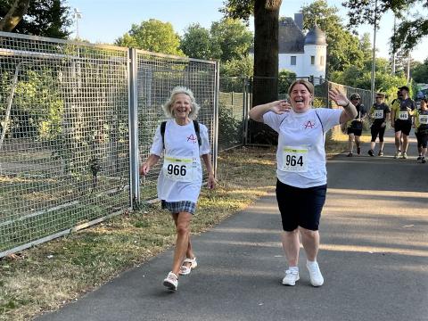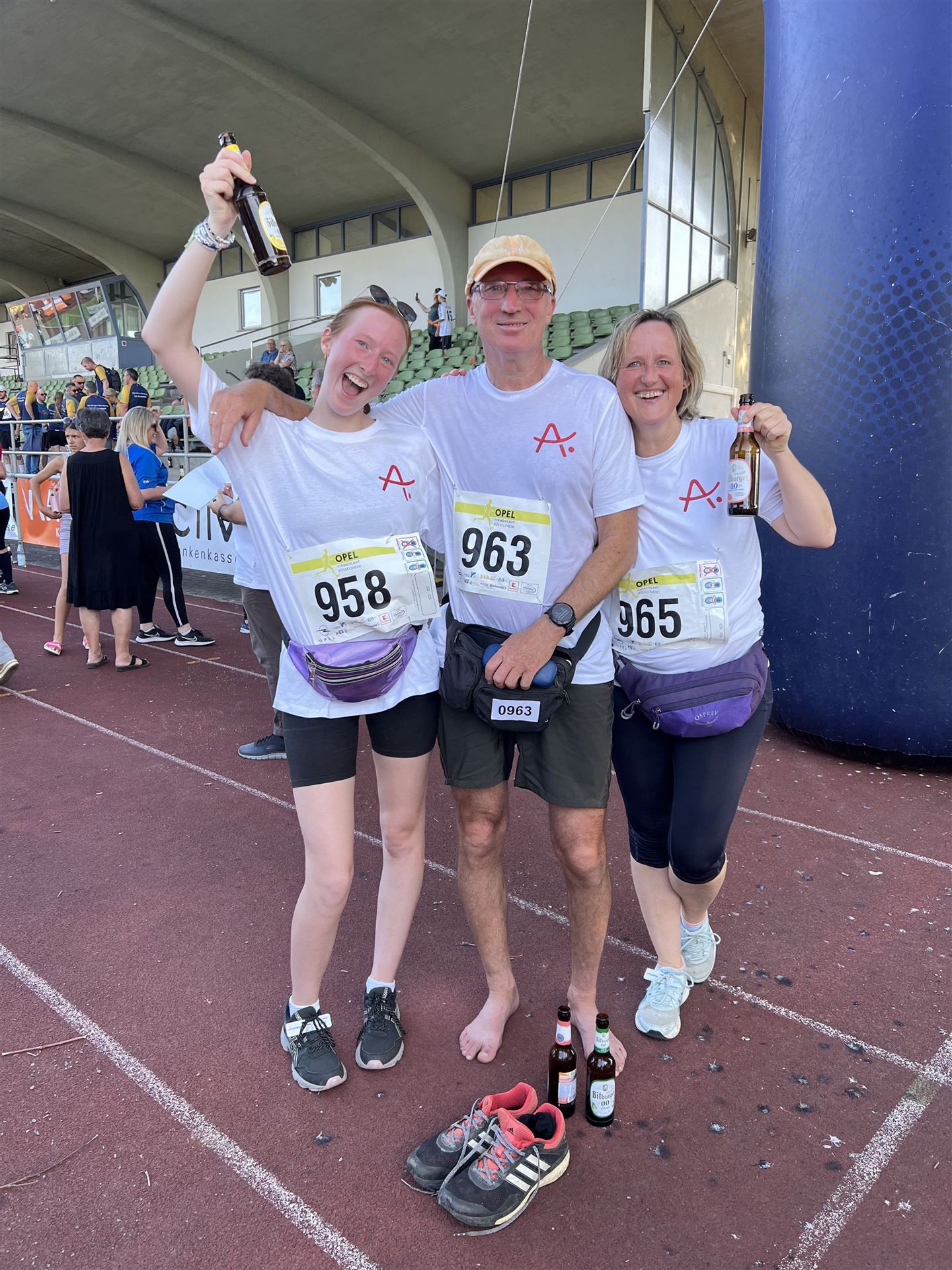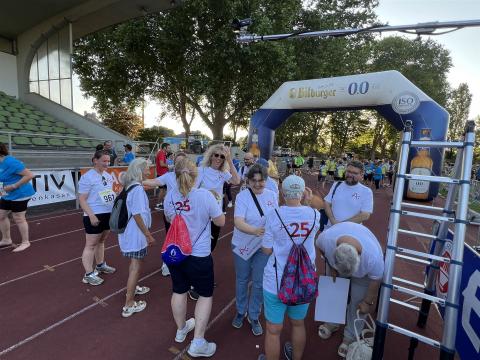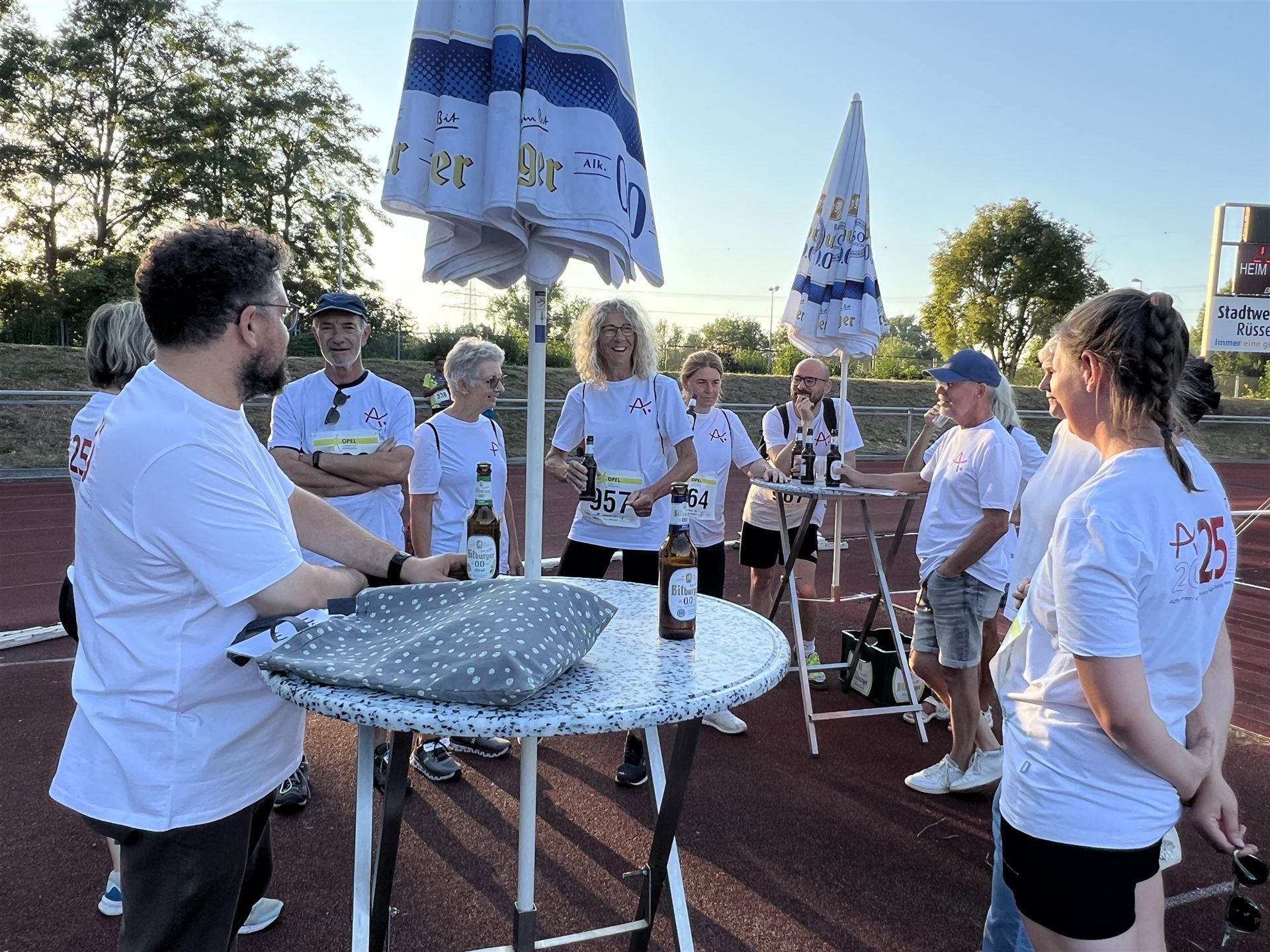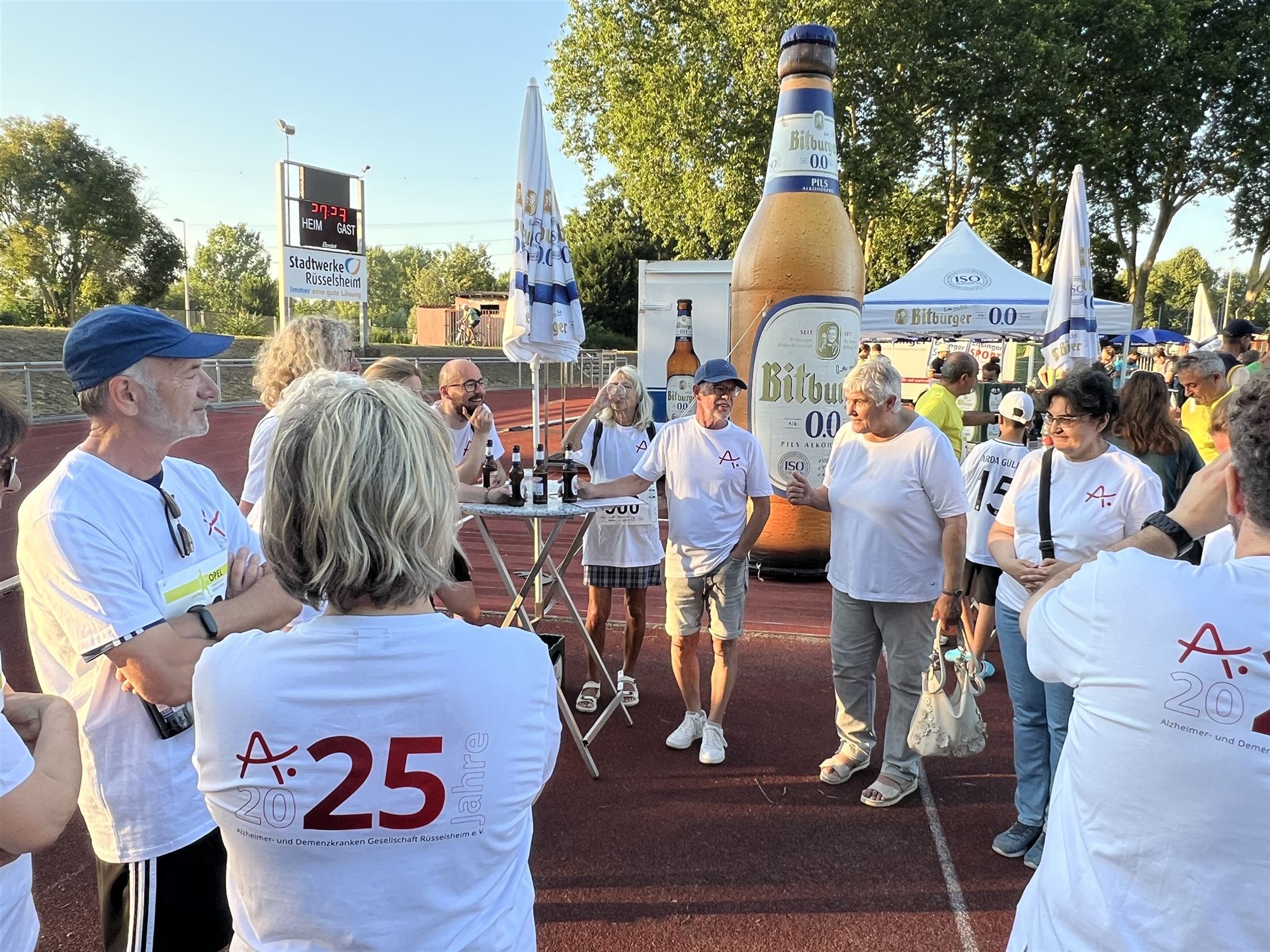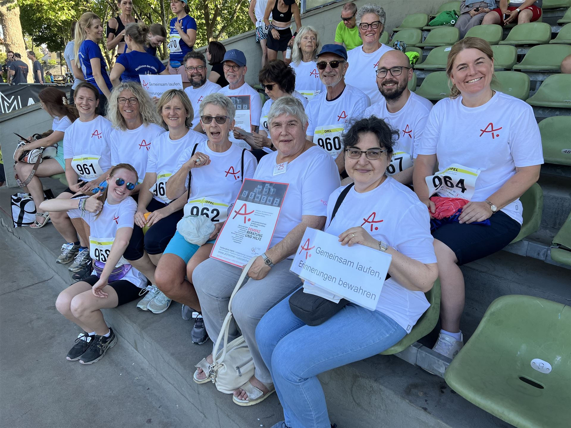 Bei warmen, aber nicht zu heißen Temperaturen (am Vortag hatte es noch knapp 40 Grad), kamen alle Teilnehmenden wohlbehalten und glücklich im Ziel an und wurden auch dort von uns gebührend empfangen. Zum Abschluss fand sich das gesamte Alzheimer-Team dann wieder im Stadion zusammen und freute sich über einen sehr gelungenen Team-Event.