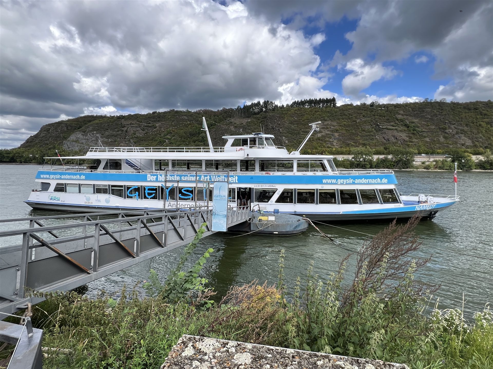 Ein weiteres Highlight war unser alljährlicher HelferDank, der in unserem 25. Jahr etwas besonderes bieten sollte. Deshalb sind wir am 30. August zu einem Ausflug mit dem Bus gestartet. Unser erstes Ziel war Andernach, wo es den höchsten Kaltwasser-Geysir der Welt gibt. Dort wurden wir am Geysir Museum in Empfang genommen und haben neben einem Kurzfilm erste Informationen von unserer Reisebegleiterin erhalten. Dann ging es mit dem Schiff weiter zur Halbinsel Namedyer Werth, wo wir den Geysir in voller Pracht bewundern konnten.